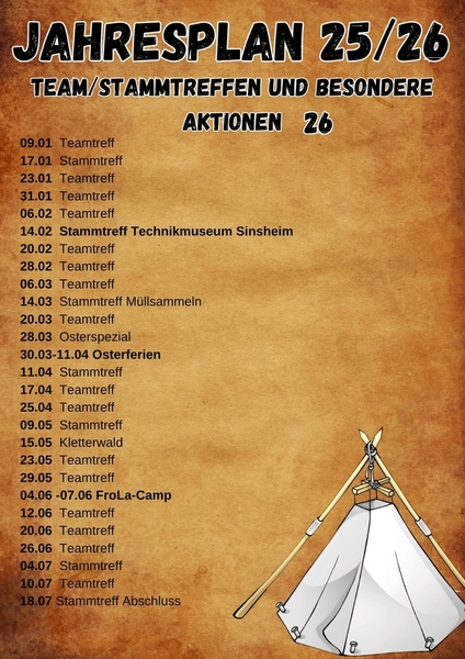 Wir treffen uns als gesamter Stamm mit mehreren Teams in den verschiedenen Altersgruppen. Dabei gibt es Teamtreffs, bei denen wir hauptsächlich Aktionen in den einzelnen Teams machen und Stammtreffs, bei denen wir als gesamter Stamm eine gemeinsame Aktion durchführen. Jede Woche gibt es einen gemeinsamen Start und Abschluss.